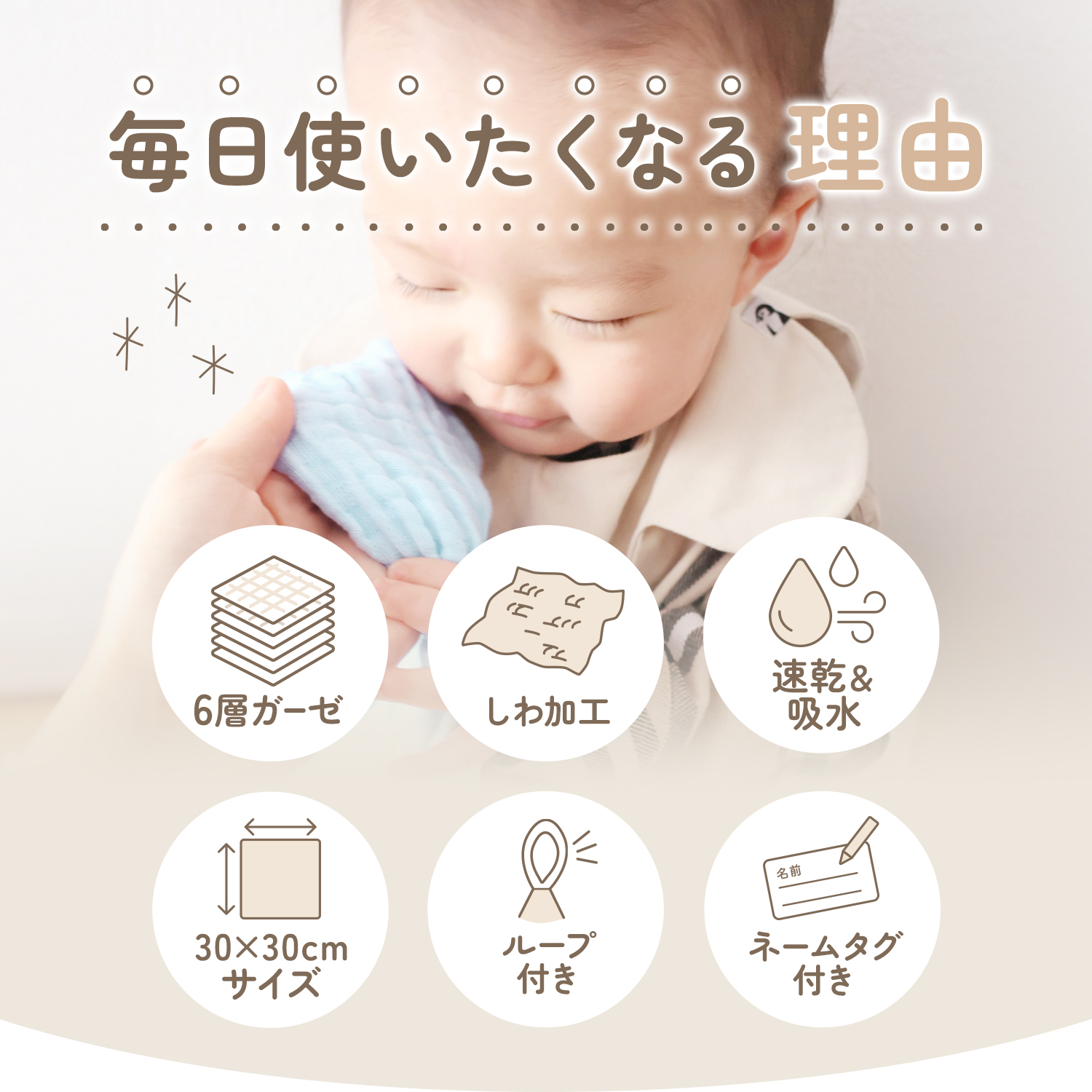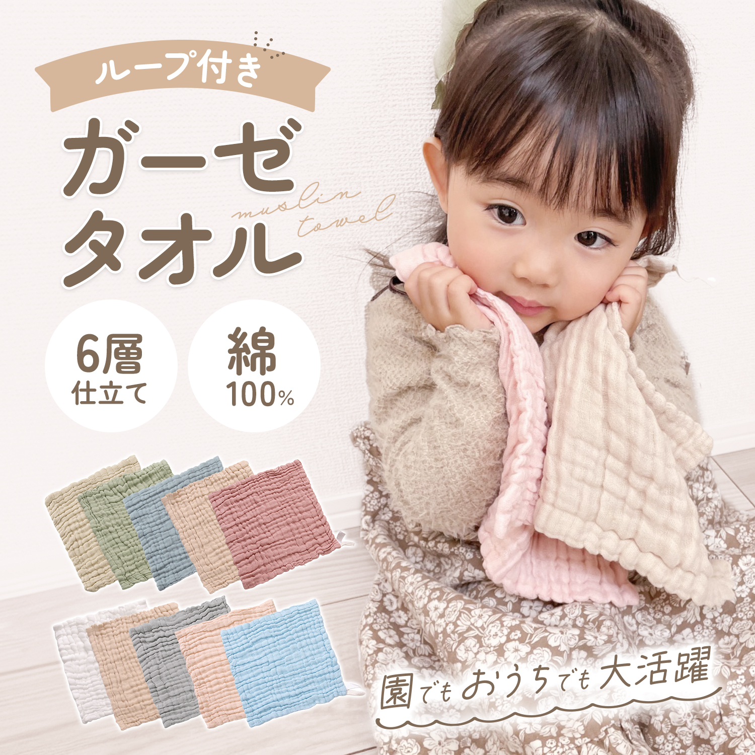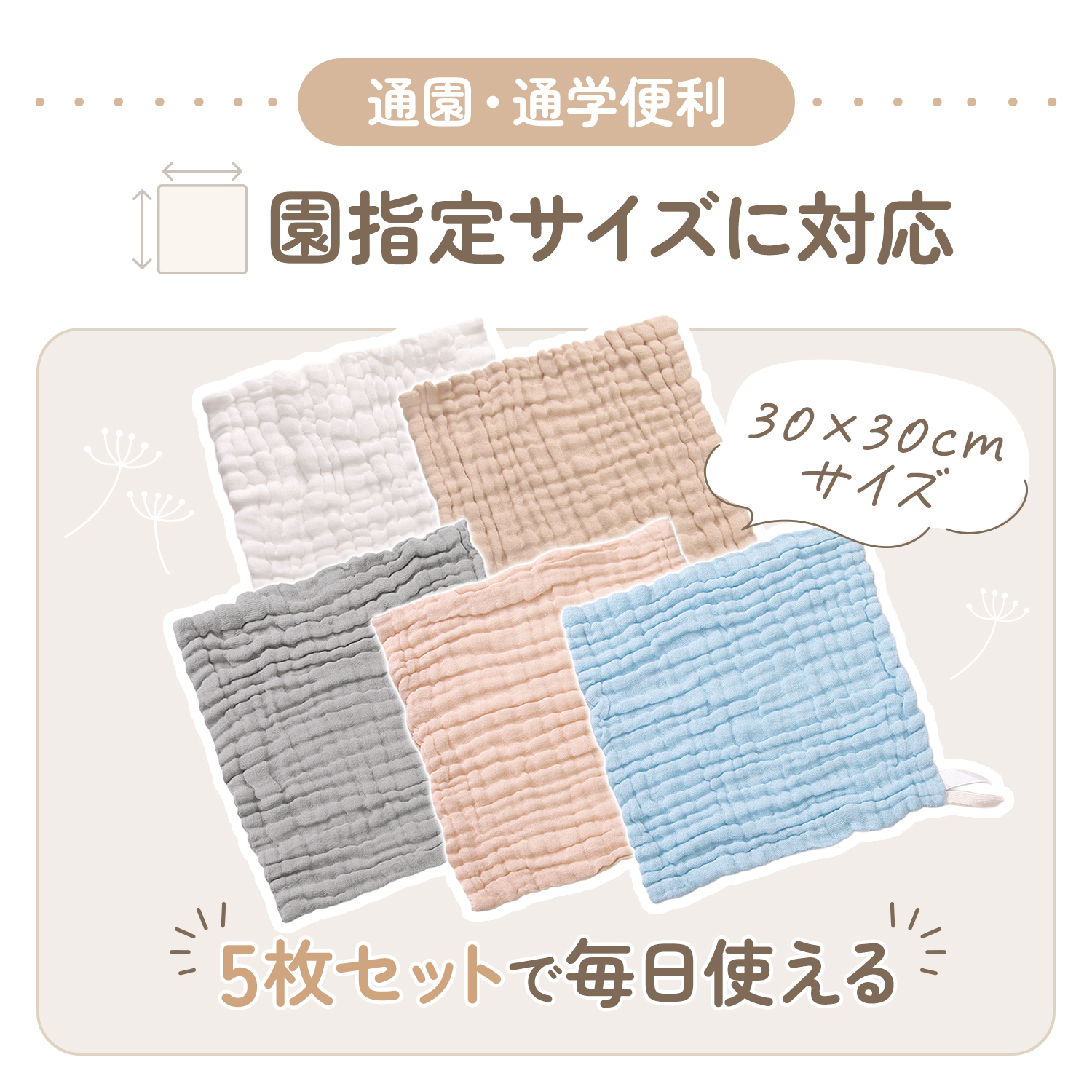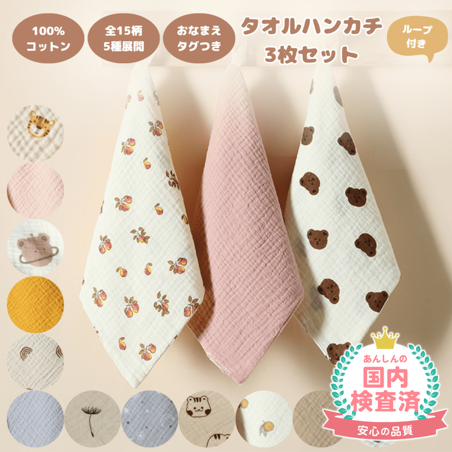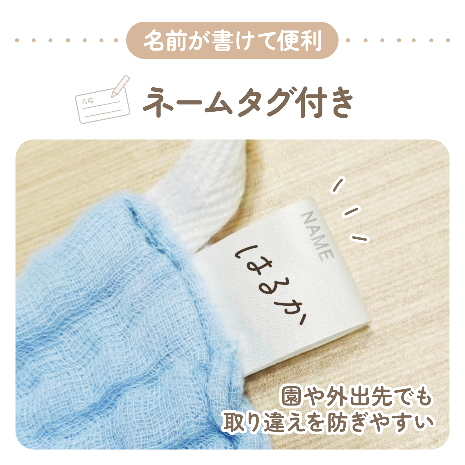 4層ガーゼで吸水性&速乾性抜群!入園準備にピッタリのお名前タグ付き・サイズ