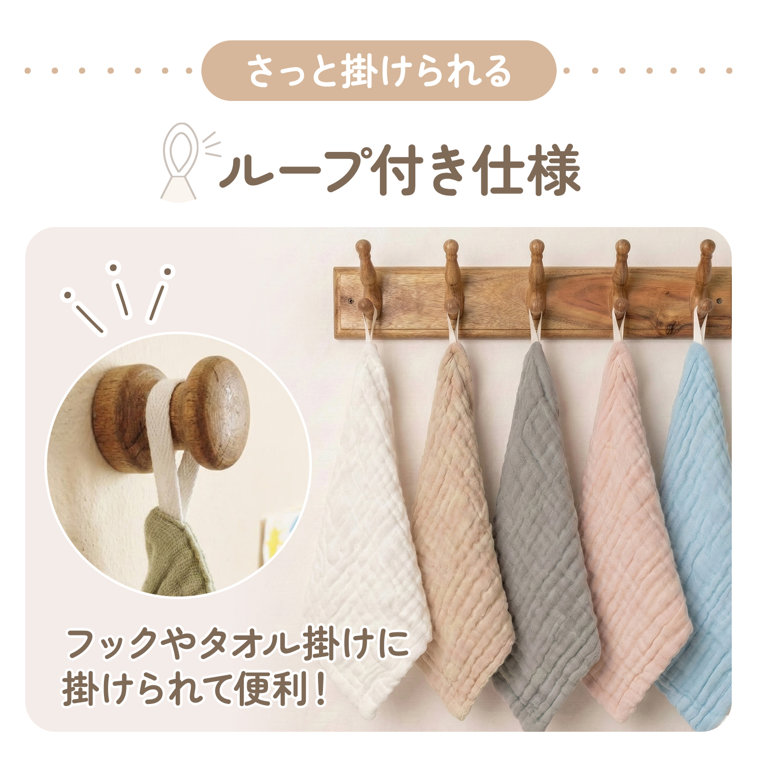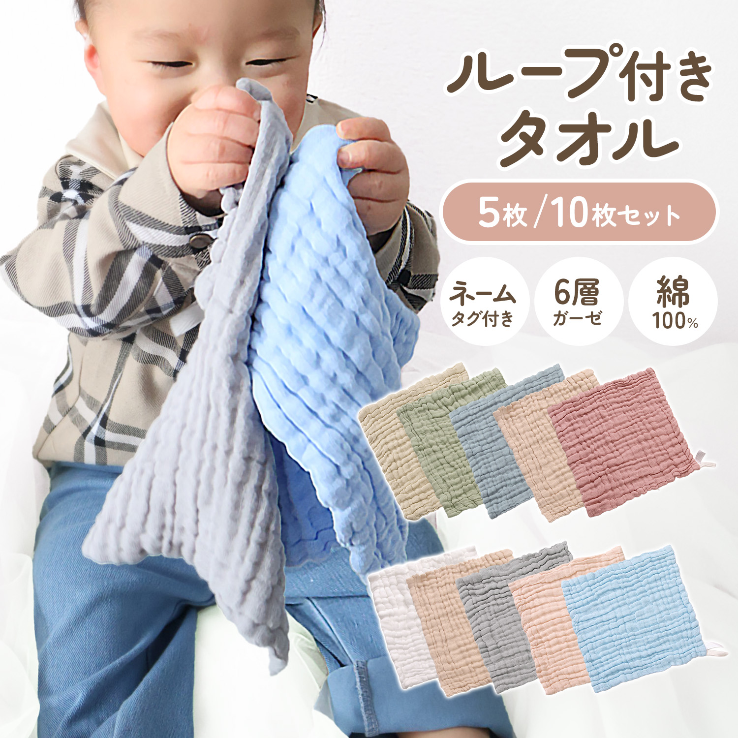 ループ付きタオル 保育園 ガーゼハンカチ 5枚セット 赤ちゃん ベビー ガーゼハンドタオル ガーゼタオル ガーゼ 新生児 幼稚園 お名前タグ付き 男の子 女の子