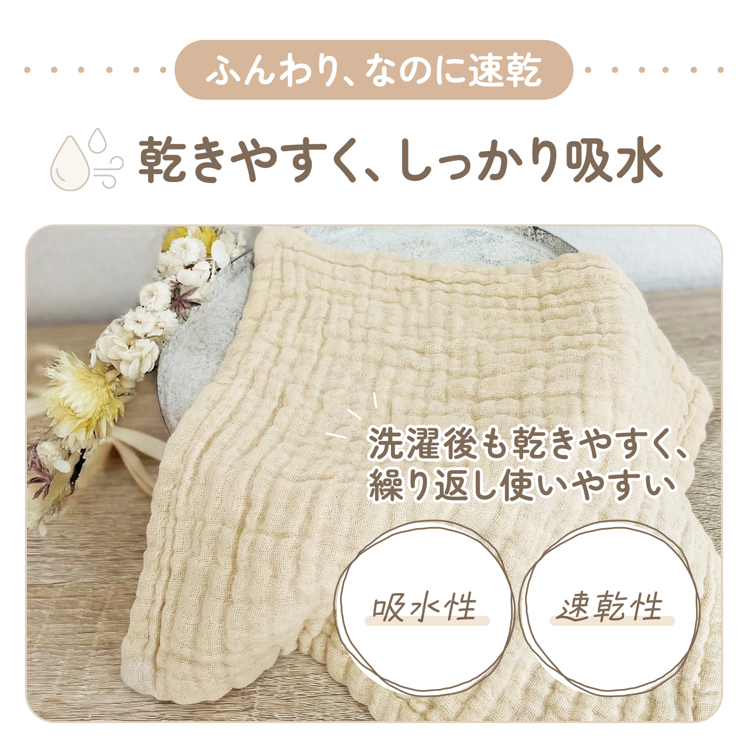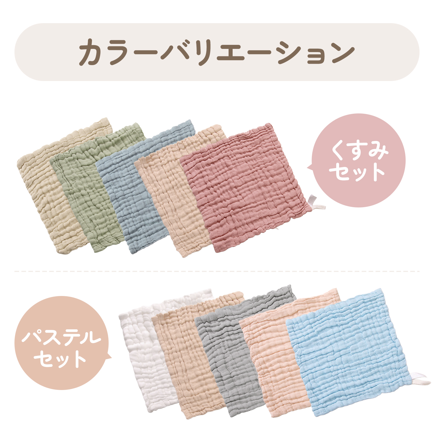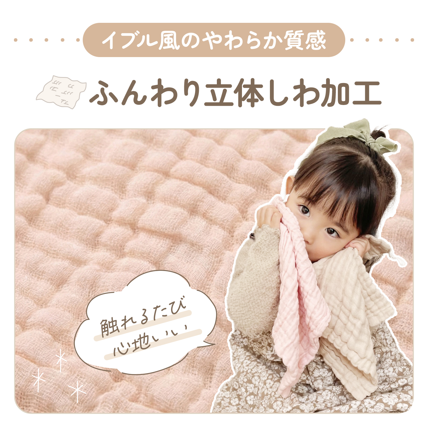 綿100%素材を重ねることで、扱いやすさと心地よい使用感を両立しています。