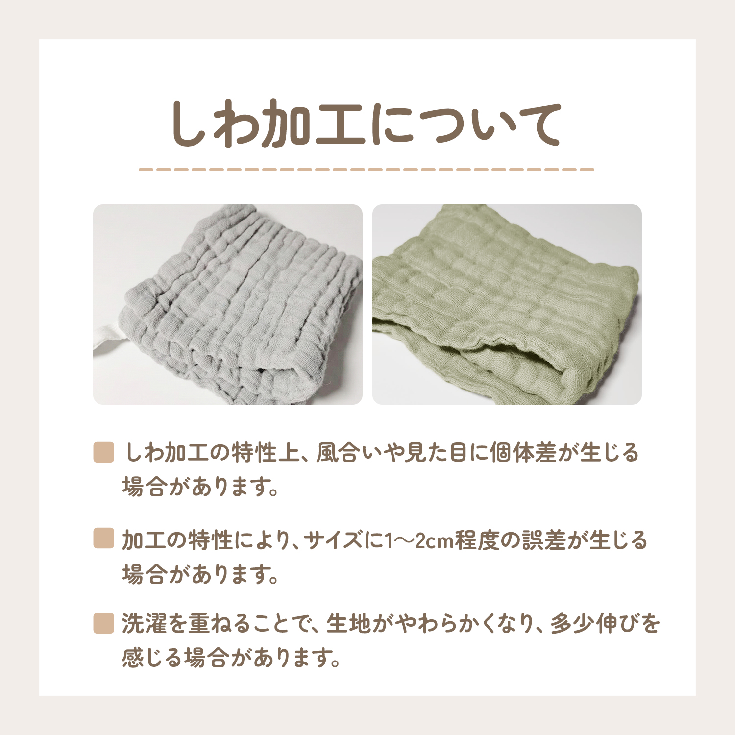 ガーゼ素材ならではの特性により、洗濯を重ねることで生地がほぐれ、やわらかな風合いへと変化します。