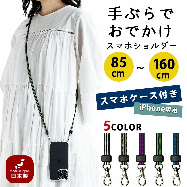 | 商品詳細 | 手ぶらで身軽にスマホを持ち歩ける、話題のスマホショルダーです。 最短85cm〜160cmと幅広く調節できるから、斜め掛けにも、首掛けにも対応できる優れもの。 ストラップ紐はポリエステル100%、柔らかくて肌にやさしい平紐を使用しているので、ごわつき感もなく快適にお使いいただけます。 部材には付外しカンタンな細身のナスカンを使用しています。 製造から企画まで国内当社工房にて行っている安心の日本製です。 ユニセックスデザインでメンズ(男性用)、レディース(女性用)どちらでもご利用いただけますし、長さ調整もできますのでお子様にもピッタリです。 |