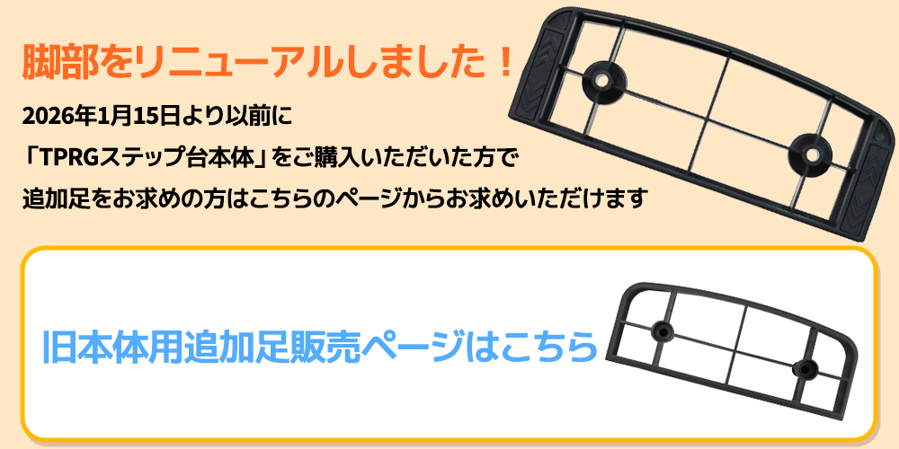 接続部の形状が異なるため、お手持ちの本体の購入時期を必ずご確認の上、お間違いのないようお願いいたします。コチラはTPRGステップ台専用追加足パーツです。