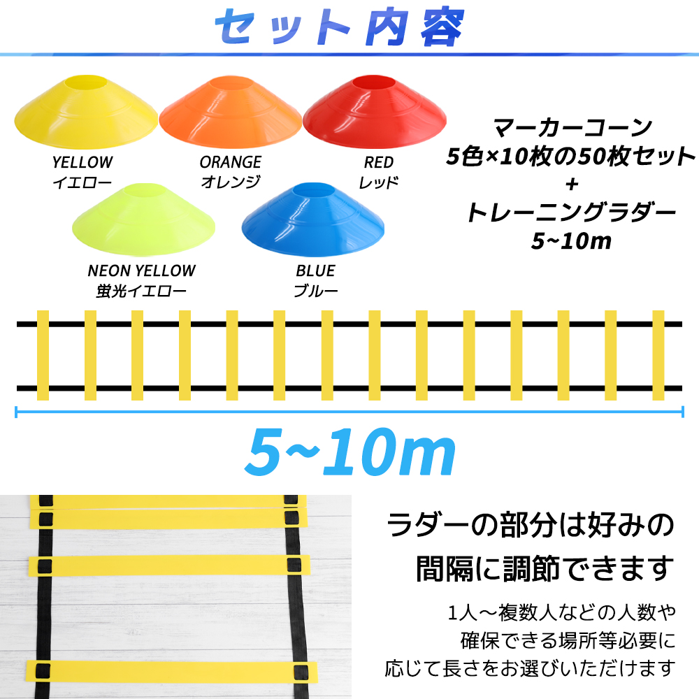 【送料無料】 5m 6m 7m 10m トレーニングラダー ラダー 50枚入り 5色 マーカーコーン アジリティ トレーニング ラダートレーニング サッカー フットサル バスケット 野球 ソフトボール ラグビー 陸上 陸上競技 剣道 持ち運び 軽量 小学生 初心者 子供 収納袋 新作入荷 フラット スポーツ プロ仕様 スポーツ器具 入門 練習用 練習 ドリブル ダイエット 反復横跳び 筋トレ サッカーボール 球技 敏捷性 サッカー教室 持ち運べる 部活 運動 おすすめ オススメ お勧め トレーニングコーン 目印 軽量