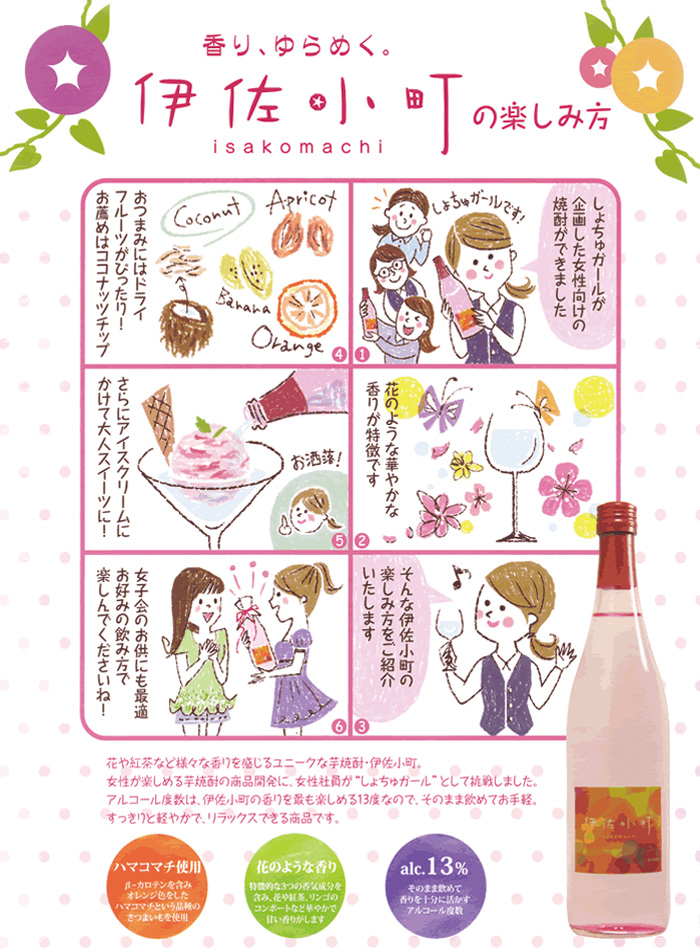 ●とてもオシャレな芋焼酎で、アルコール度数も低いので(13度)女性の方に是非オススメしたい商品です。