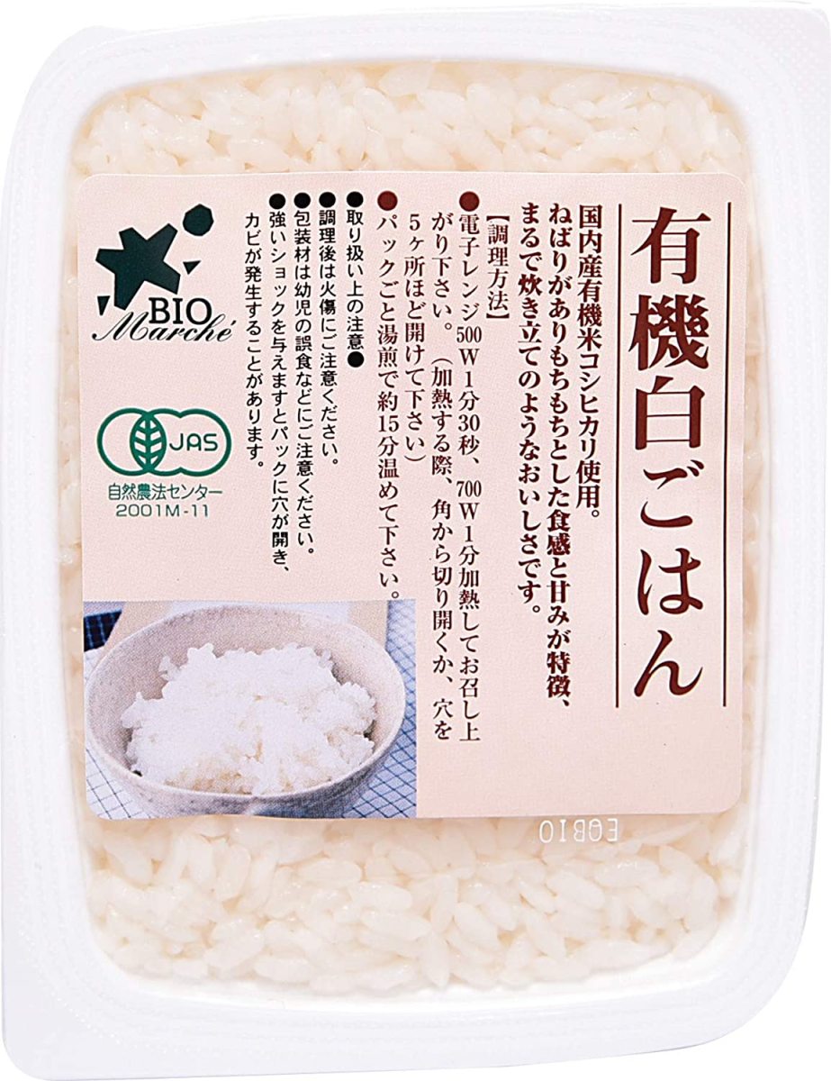 ビオ・マルシェが目指すオーガニックライフ「有機農業に携わるひとたち」と「食べることで、有機農業を応援するひとたち」両者を結ぶことで、有機農業が発展し、自然の生態系が維持されます。その結果、環境に配慮した暮らしが実現します。有機農業は、環境や多様性に富む生きものとの調和を大切にし、持続可能な社会をめざす考え方に基づいています。自然の声に耳を澄まし、季節を感じ、無理をせず、無駄も少なくすること。「できること」から始めるのが、オーガニックライフです。手軽に楽しめる!ビオ・マルシェ 人気の 有機白ごはん国内産有機米コシヒカリをレトルトごはんにしました。「炊いたご飯がちょっと足りなかった」なんて時にも重宝します!圧力鍋で炊き上げているのでもっちりとした食感が特徴です。ねばりがありもちもちとした食感と甘みが特徴まるで炊き立てのようなおいしさです。防災用にもストックしておくと安心※写真はイメージです。梅干しは付いていません。ビオ・マルシェのレトルトご飯シリーズビオマルシェこだわりの有機白ごはん製造元のコジマフーズは「少量生産・美味しさ重視」をモットーに製品づくりをされています。なんと!家庭用の圧力釜で作るほどの徹底した少量生産ぶり手間がかかるものの、大きい釜でつくるよりも味が大味にならず美味しく作られるという製造スタイル有機JASマークは約束がある食べ物お届けするのは信頼の証有機JASマークは、太陽と雲と植物をイメージしたマーク。農薬や化学肥料などの化学物質に頼らないで、自然界の力で生産された食品を表しており、農産物、加工食品、飼料及び畜産物に付けられています。有機食品のJAS規格に適合した生産が行われていることを登録認証機関が検査し、その結果、認証された事業者のみが有機JASマークを貼ることができます。