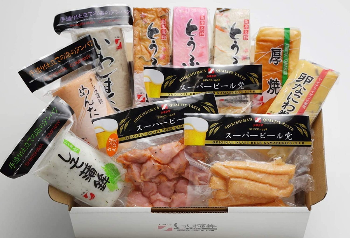とうふ蒲(赤・ヒロス・揚ヒロス)、厚焼き、卵なにわ巻、いわしまくら、めんたい蒲、しそ蒲鉾、ビール党(イワシ・明太・かっぱえび天)合計11点