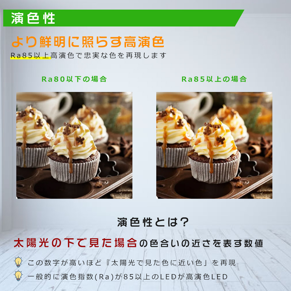 | 【高演色性Ra85以上】 | 高演色で照らされた物が目に見える色を再現できます!インテリアには照明に対する要求が大満足です。 |