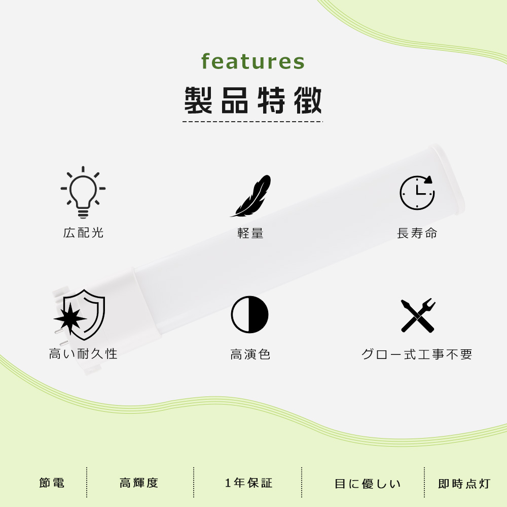 | 【チラツキなし】 | LED照明は内部で直流へ変換するためチラツキがほとんど無いです。目に優しい照明です。 |