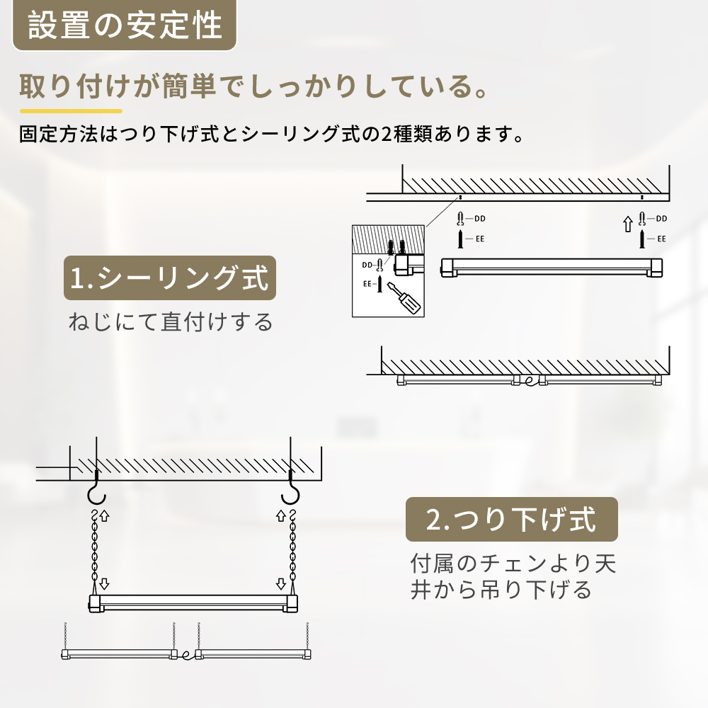 | 【器具一体型】 | 照明器具と電源が一体化しているため、設置が簡単で、メンテナンスも効率的です。個別の部品を扱う必要がありません。また、部品がしっかりと組み込まれているため、外部の配線や接続が不要で、接続不良や安全リスクを減らすことができます。 |