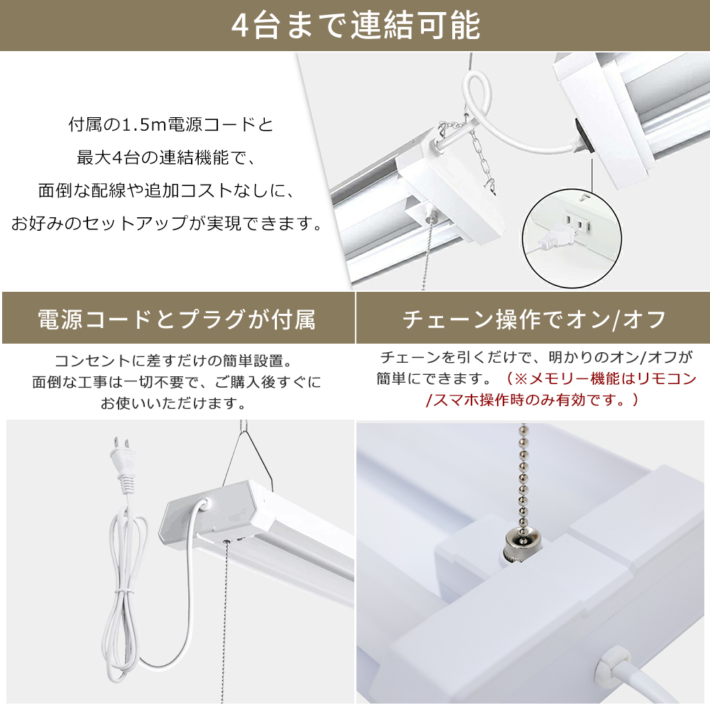 | 【連結可能の設計】 | ACプラグ付き電源コードを別のライトのソケットに差し込むことで、ライトを連結することができます。本製品は最大4台連結可能です。 |