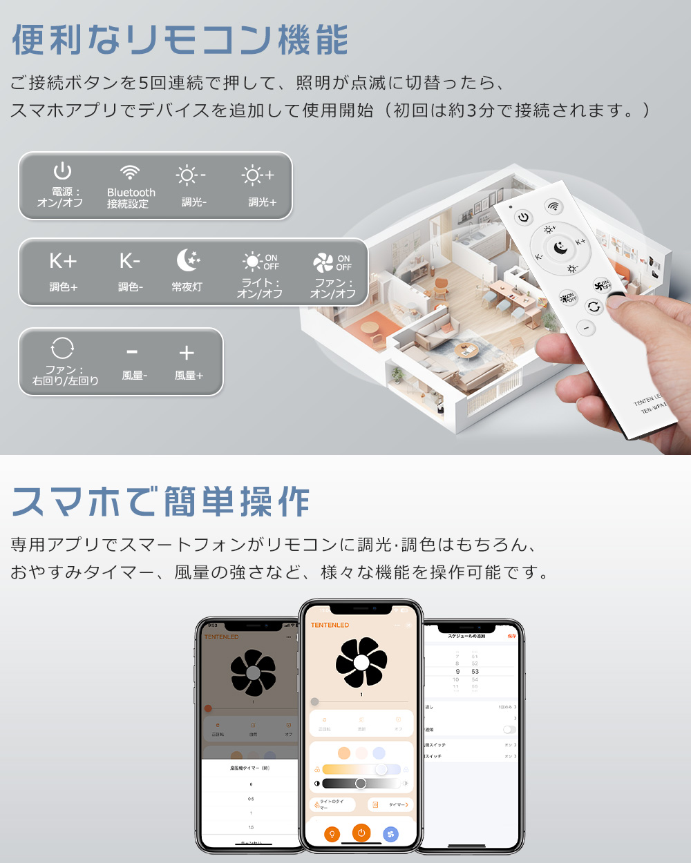 | 【スマホ操作】 | 専用のスマートフォンアプリを使って、簡単に操作でき、非常に便利です。このアプリは、ユーザーに優しいインターフェースを提供し、前回のオフ時の設定を直接選択できるため、面倒な手動調整をする必要がなく、時間と労力を節約できます。照明の明るさや色温度、またはファンの風速に関しても、ユーザーは軽くタップするだけで、最適な状態に瞬時に戻すことができます。 |