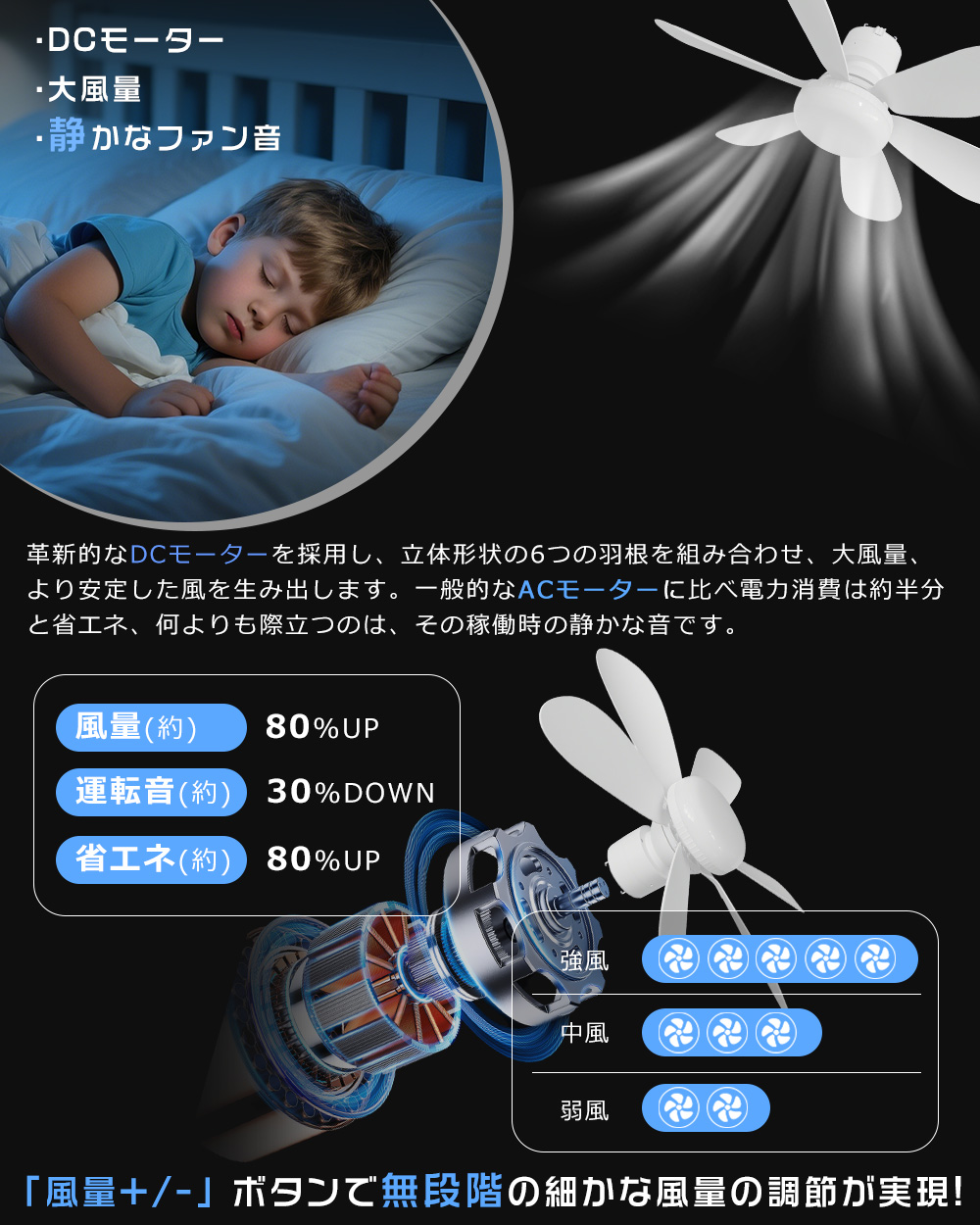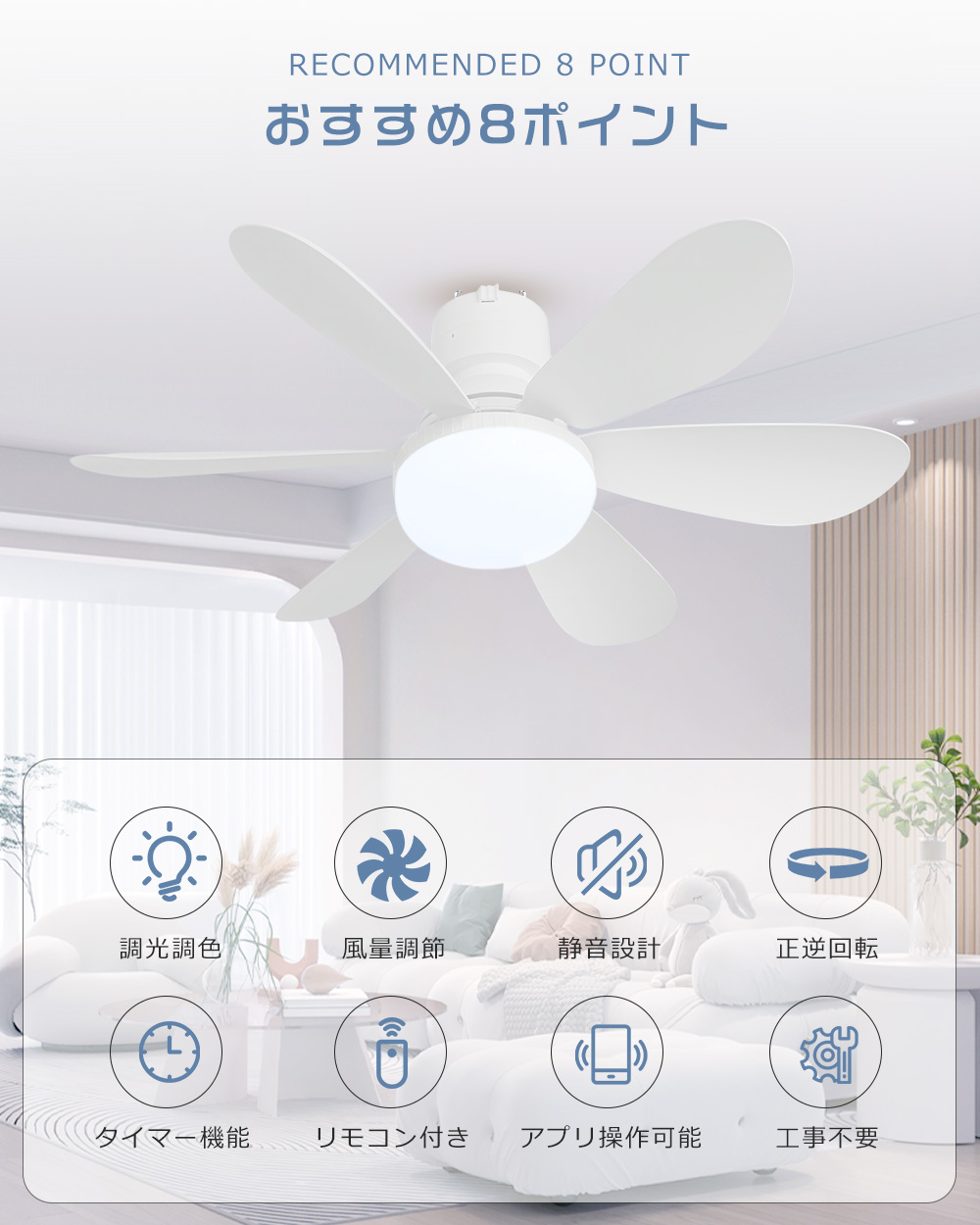 | 【Alexa・Google対応のスマートライト&ファン】 | Alexa、Google アシスタントなどのスマートスピーカーと連携可能です。 お手持ちの音声アシスタントに対応しており、「電気をつけて」「風量を下げて」などの音声コマンドで、ライトやファンを簡単に操作できます。 料理中や就寝前など手が離せない場面でも、リモコンを使わずに快適に操作できるため、日常生活がよりスマートで便利になります。 |