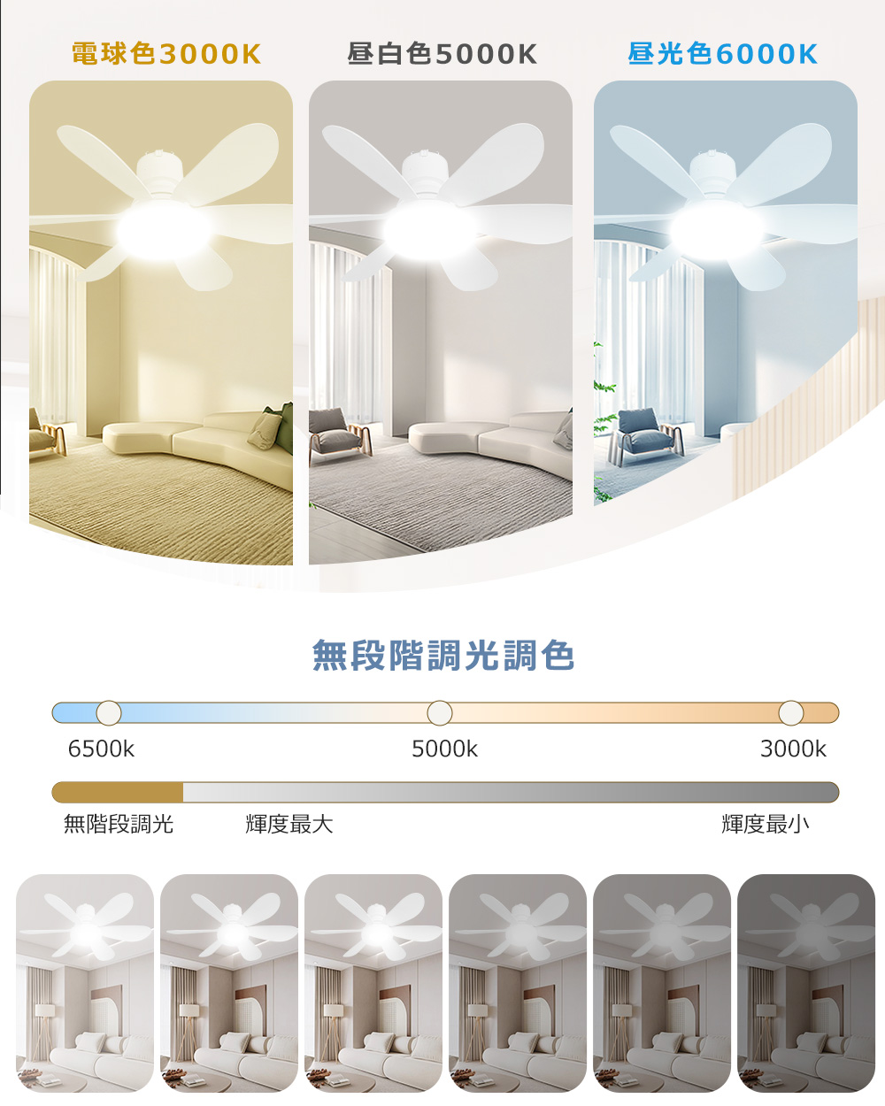 | 【無段階調光調色と風量調節機能】 | ユーザーはニーズに応じて光の明るさと色温度を自由に調整し、理想的な雰囲気を作り出すことができます。温かみのある黄光から明るい白光まで、自由に切り替えることができ、さまざまなシーンに対応します。同時に、風量調節機能も多様な風速オプションを提供しており、柔らかな微風から強力な風力まで、ユーザーの快適さに応じて精密に調整できるため、居住空間をより快適に保つことができます。 |
