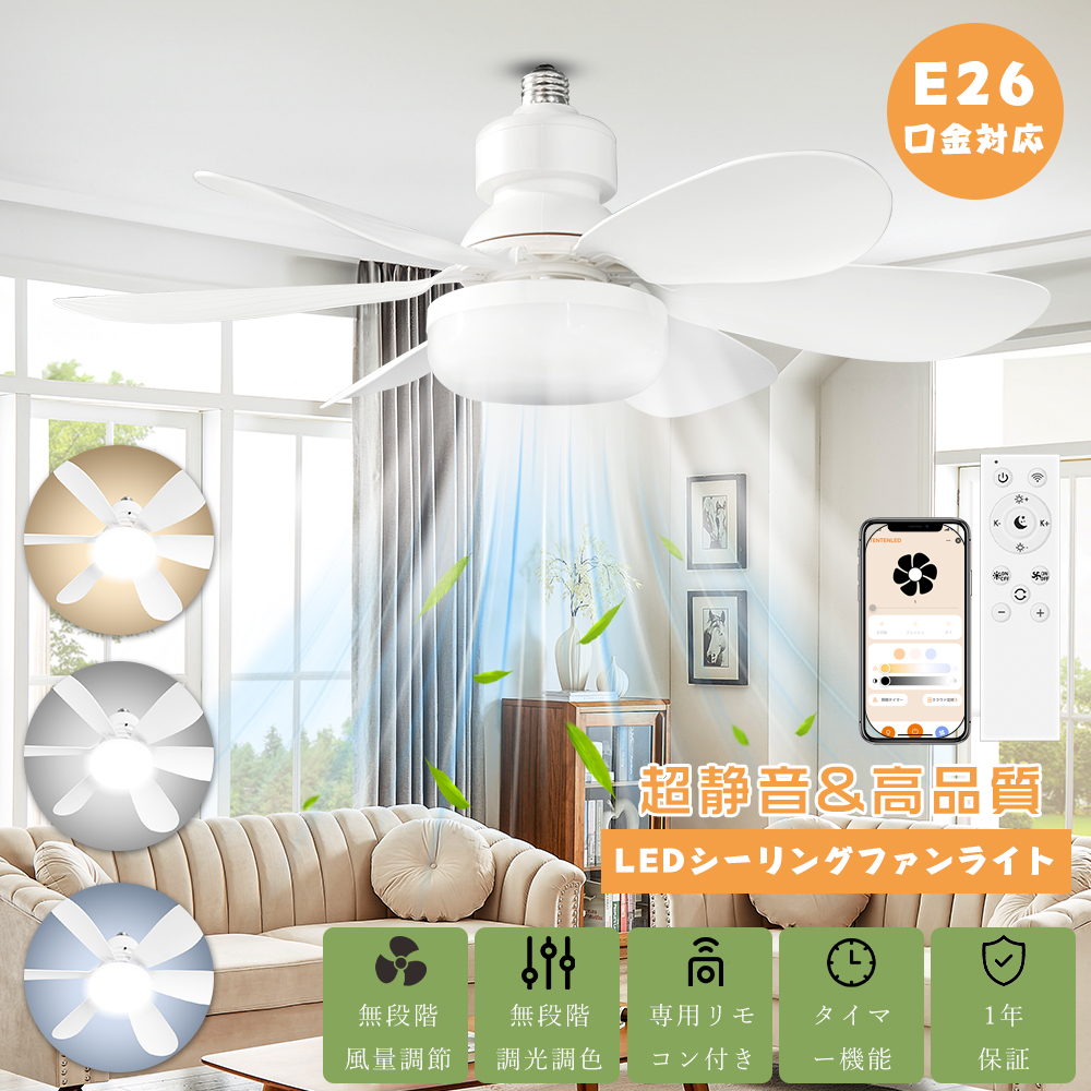 【1年保証】LEDシーリングファンライト ファンライト 6畳 8畳 シーリングファン E26 ファン付き照明 調色調光 逆回転機能 6枚羽根 空気循環 扇風機 天井照明
