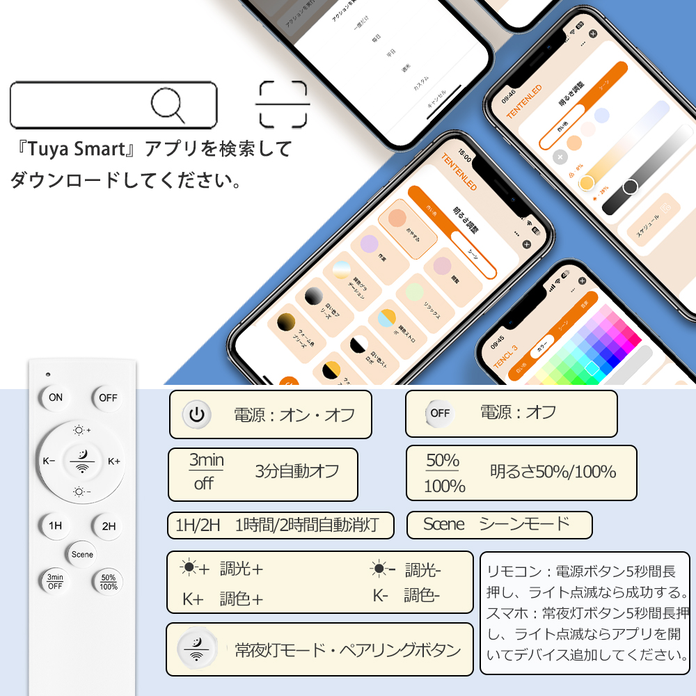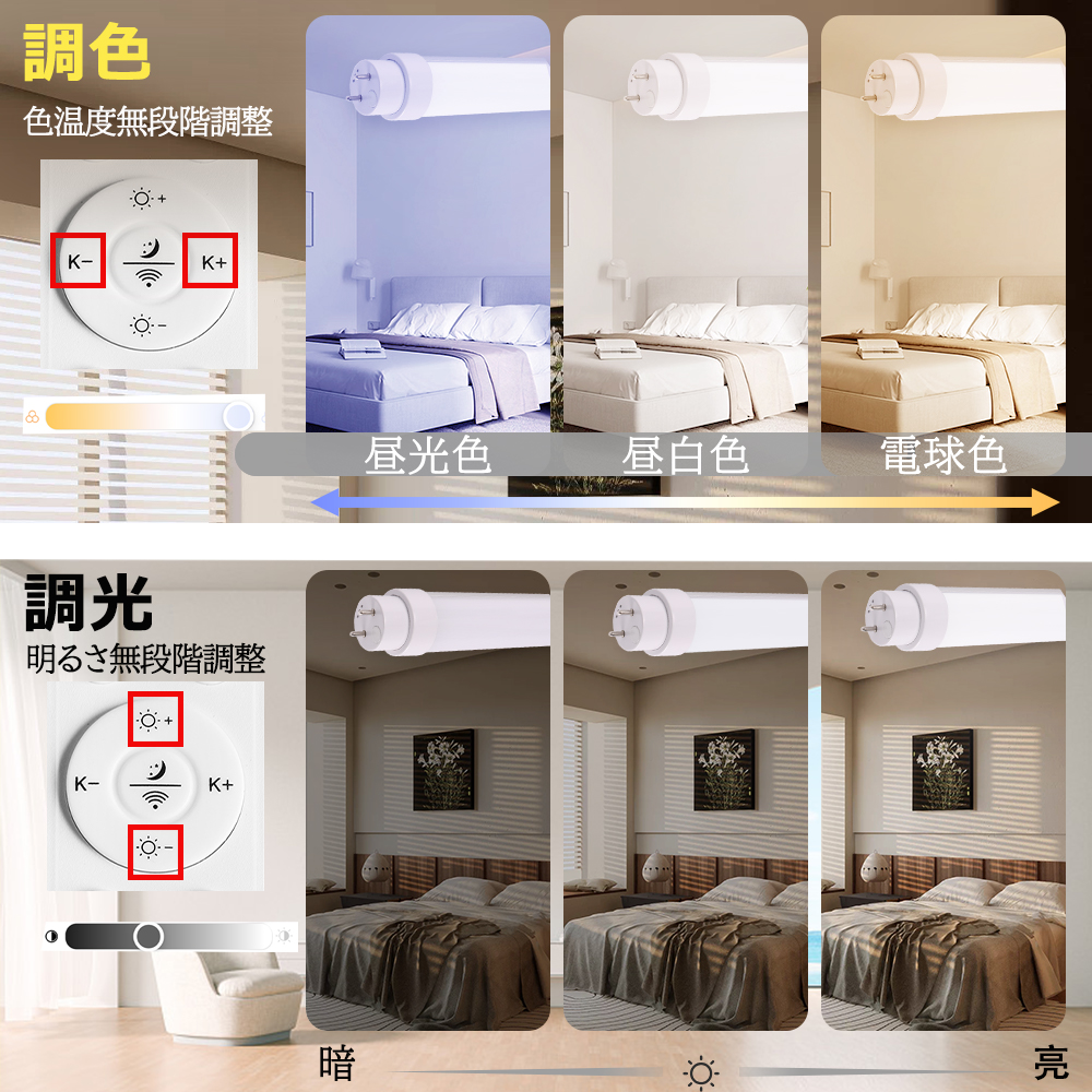 | 【無段階調光調色】 | 本製品は無段階調光調色することができます。リモコンとスマホで操作すれば調光調色を実現できます。スマホで明るさと色温度の画面を操作すれば調光調色ができます。リモコンの“+”、“‐”を押すと、明るさと色温度を変更できます。 |
