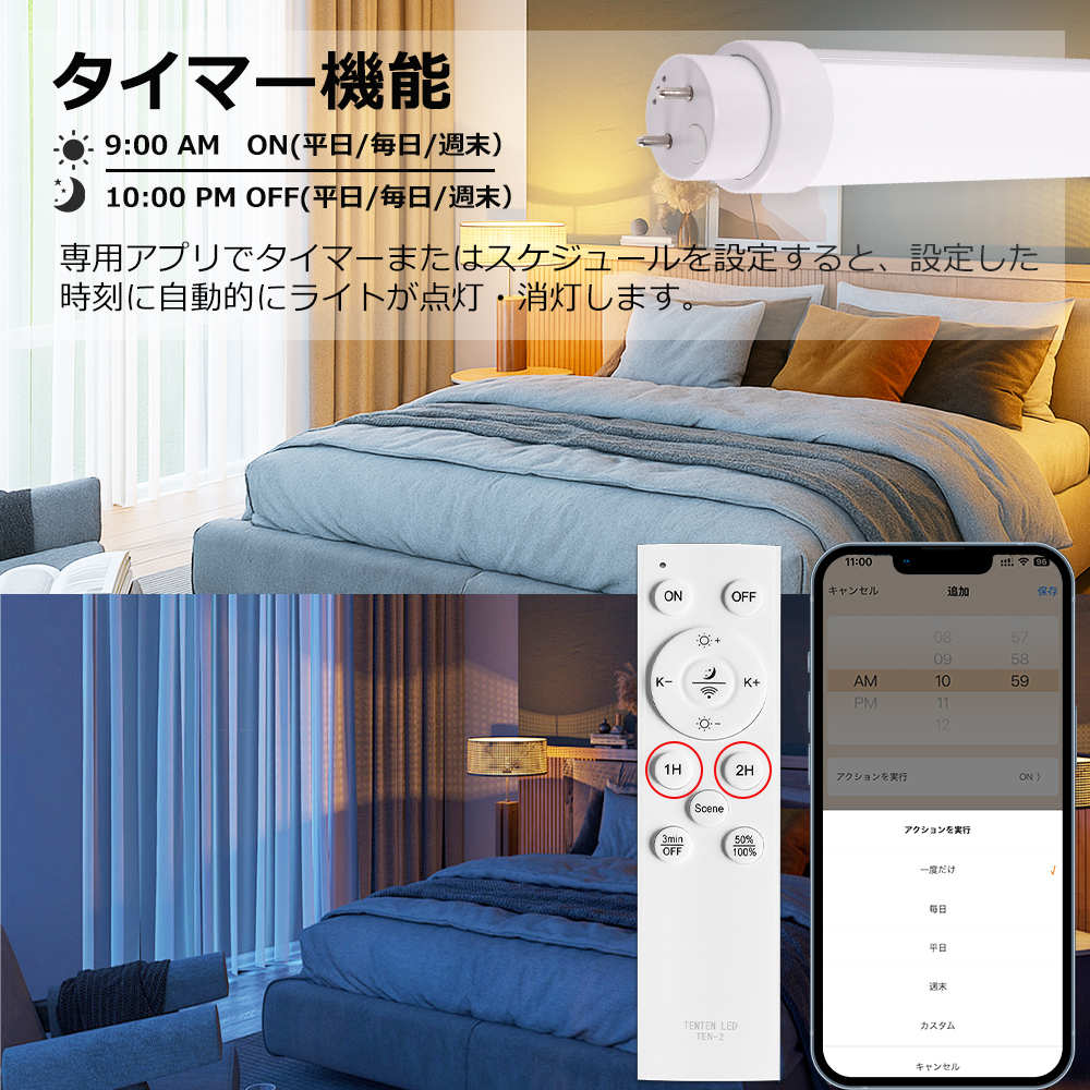 | 【安心なタイマー機能】 | 本製品にはタイマー機能が搭載されており、リモコンで1時間/2時間後に消灯することが設定できます。スマホアプリを使えば、設定したい時間を自由にタイマーを設定することができます。この機能は、お子様が定時に就寝する習慣を身につけるのに役立ち、より良い成長を促進します。また、大人にとっても、夜の時間を管理し、良い睡眠習慣を確立するのも役立ちます。 |