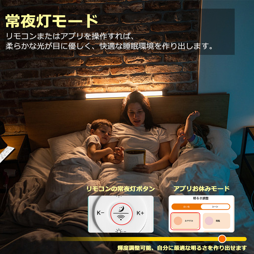 | 【常夜灯機能付き】 | リモコンの常夜灯ボタンを押すと、常夜灯を開きます。常夜灯は夜間授乳や病人の看護に最適です。3%の明るさで照明してくれて、目に優しくて節電です。年取ってから、脚が悪くなる高齢者達にとって、常夜灯モードにすると、夜起き時に、怪我予防にも役たちになる。スマホでは【おやすみモード】をクリックと、常夜灯を設置可能です。 |