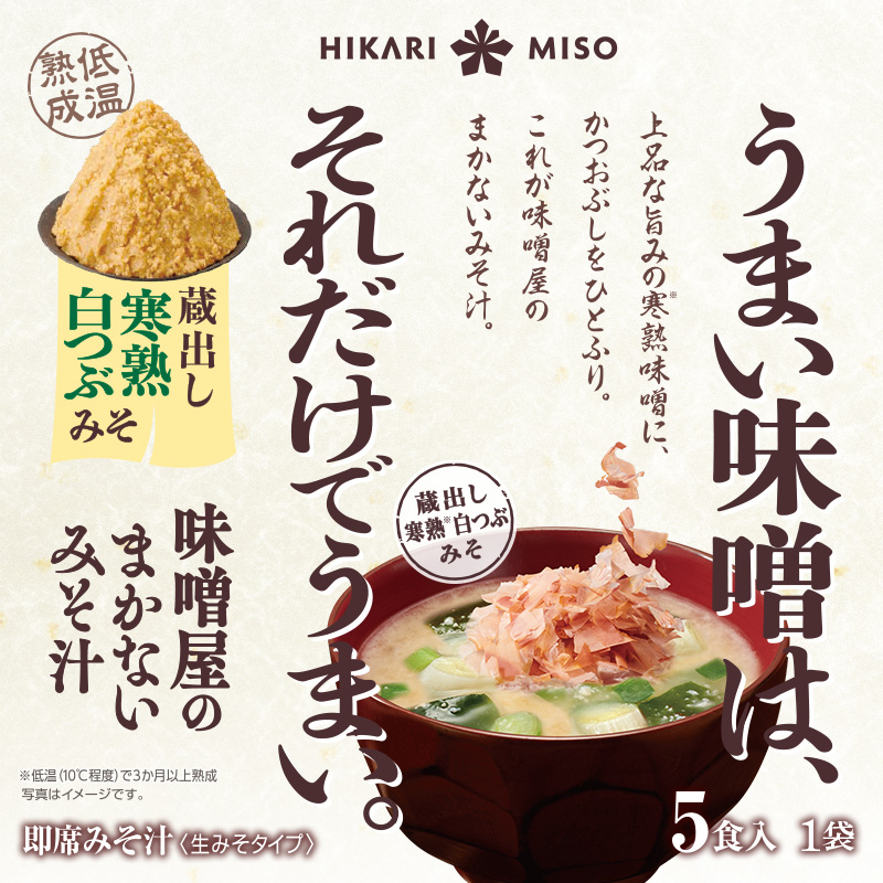 味噌屋だから知っているとっておきのおみそ汁を、商品にしました。味噌蔵に眠っているじっくり熟成された味噌に、具を入れてお湯を注ぎ、最後にかつおぶしをパラッとひとふり。素材本来の豊かな味わいをお楽しみいただけます。