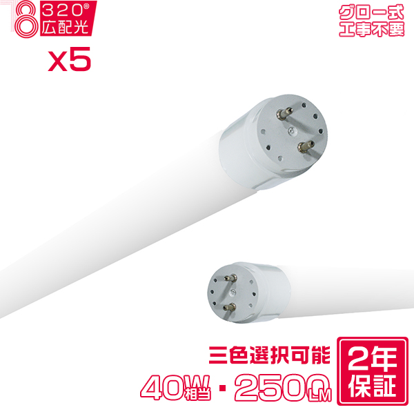 led蛍光灯 40W形 広角320度「5本入り」T8直管 G13口金 120cm 2500LM SMDチップ FL40 グロー式工事不要 ポリカー 軽量 2年保証 色選択