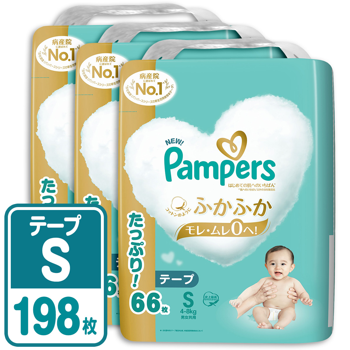 NEW! パンパース オムツ 肌へのいちばん* コットンのようにふかふか モレ・ムレ0へ!病産院に選ばれてNo.1^史上最高のやわらかさ# 厳選されたやわらかな素材で、極上の肌心地。 安心の8倍吸収**シルキーソフトシートと吸収体が分散して、即・吸収するから、お肌さらさら。Wモレガード3D 穴あきメッシュシートと、2倍のびのびフィットテープ***ゆるうんちも、モレ0へ!肌摩擦を軽減*シルキーソフトシートが 肌をやさしく包みます。香料 パラベン ラテックス無配合2倍のびのびフィットテープ***最高級の素材で作られています*