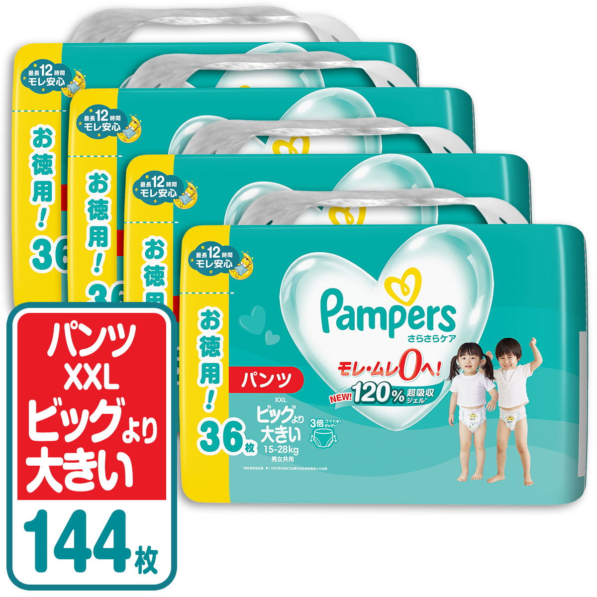 パンパース オムツ さらさらケア NEW!120% 超吸収ジェル^ モレ・ムレ0へ!最長12時間モレ安心3倍ワイド*ギャザー 脚の付け根までカバーして、横モレ0へ!独自! 1秒吸収**シート スポンジのように即吸収、お肌さらさら。穴あき通気カバー 通気穴から湿気を外に逃がすから、お肌さらさら。独自! さらさら風通しライン2.5倍***伸びる のびのびベルト12時間の吸収力独自! Sカーブフィット^P&G社従来品比較