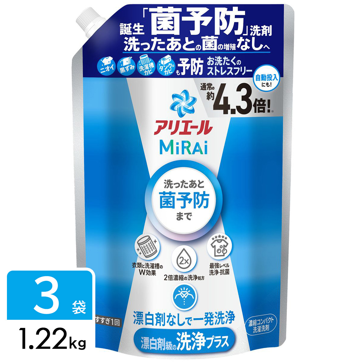 特許手法!洗ったあと菌予防まで。洗ったあとも菌の増殖なしへ。*1W効果!洗濯槽も防カビ!*2*7最強レベル抗菌・洗浄!*3 黄ばみもすっきり。漂白剤なしで一発洗浄 *4着ている服のしつこいニオイ予防 *5タオルの黒ずみ予防2倍濃縮コンパクト!*6すすぎ1回!節水・節電タテ・ドラム式・自動投入洗濯機OK* P&G社液体洗剤と23年10月時点の市場No.1酸素系液体漂白剤の併用での比較。P&G調べ。汚れの度合で落ちの程度は異なる。漂白剤は洗濯機直投入の条件で試験。