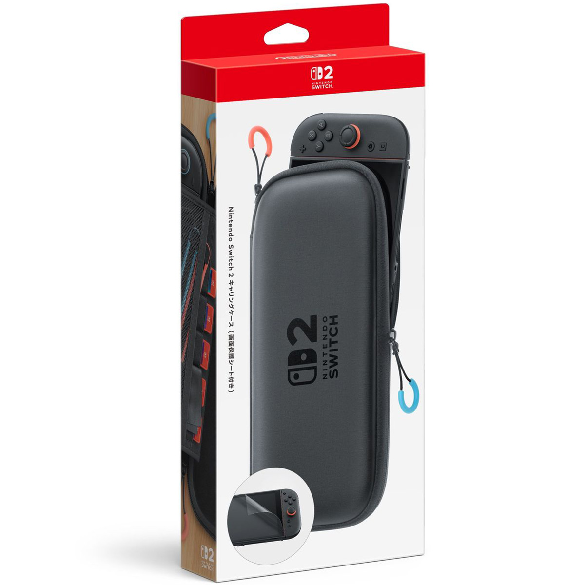 Nintendo Switch 2 本体用キャリングケースと、画面をキズや汚れから守る保護シート、クリーニングクロスのセットです。ゲームカード6枚、Joy-Con 2 ストラップ2個を収納できる仕切りパッドが付いています。
