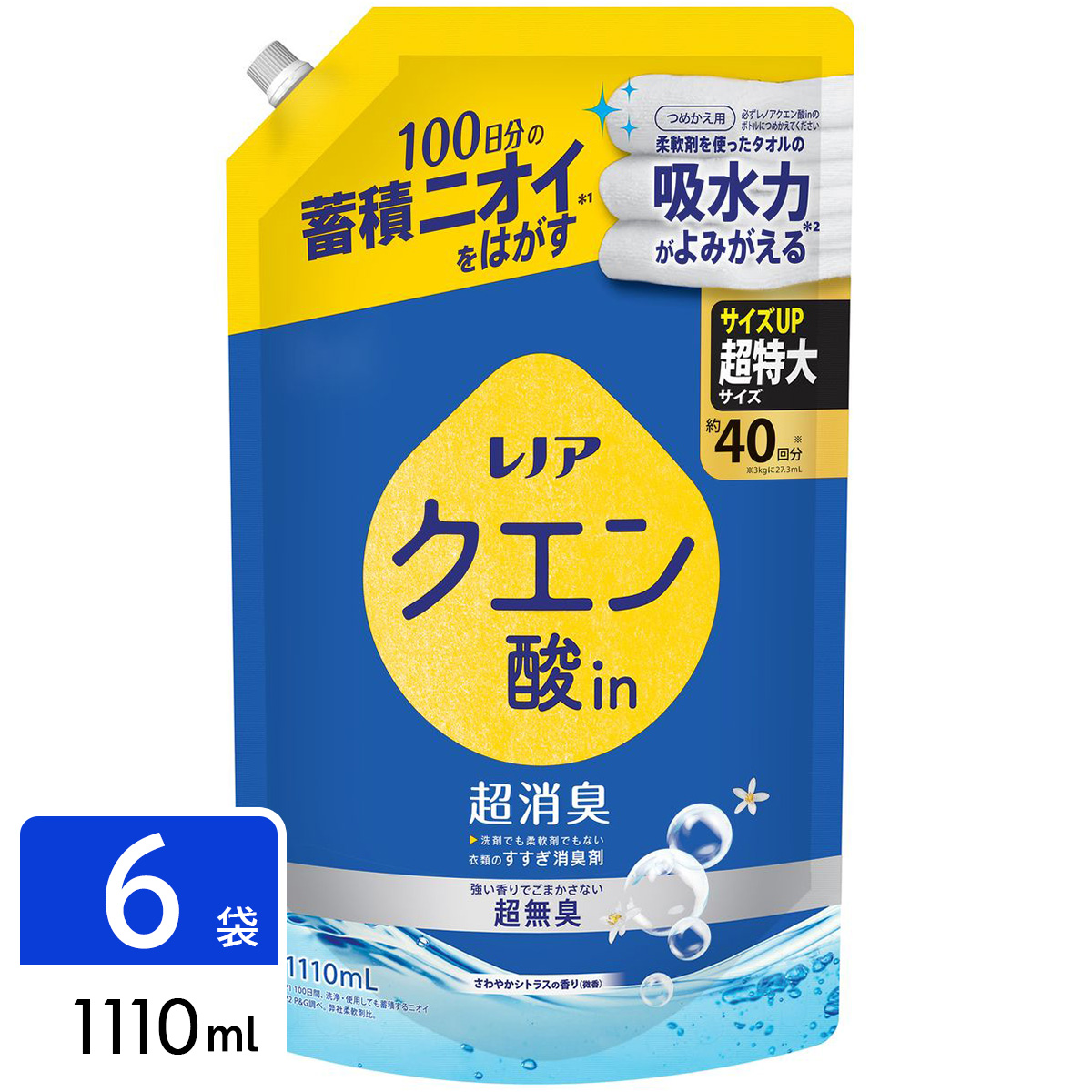 レノア クエン酸in 超消臭 衣類のすすぎ消臭剤 強い香りでごまかさない超無臭 さわやかシトラスの香り 微香 詰め替え 超特大 1110mL×6袋 最新モデル おすすめ ランキング プレゼント 新生活 一人暮らし 便利グッズ 時短家電 生活家電 ギフト 国内メーカー 安心 安全 高品質 コスパ 買い替え まとめ買い 人気商品 贈り物 定番