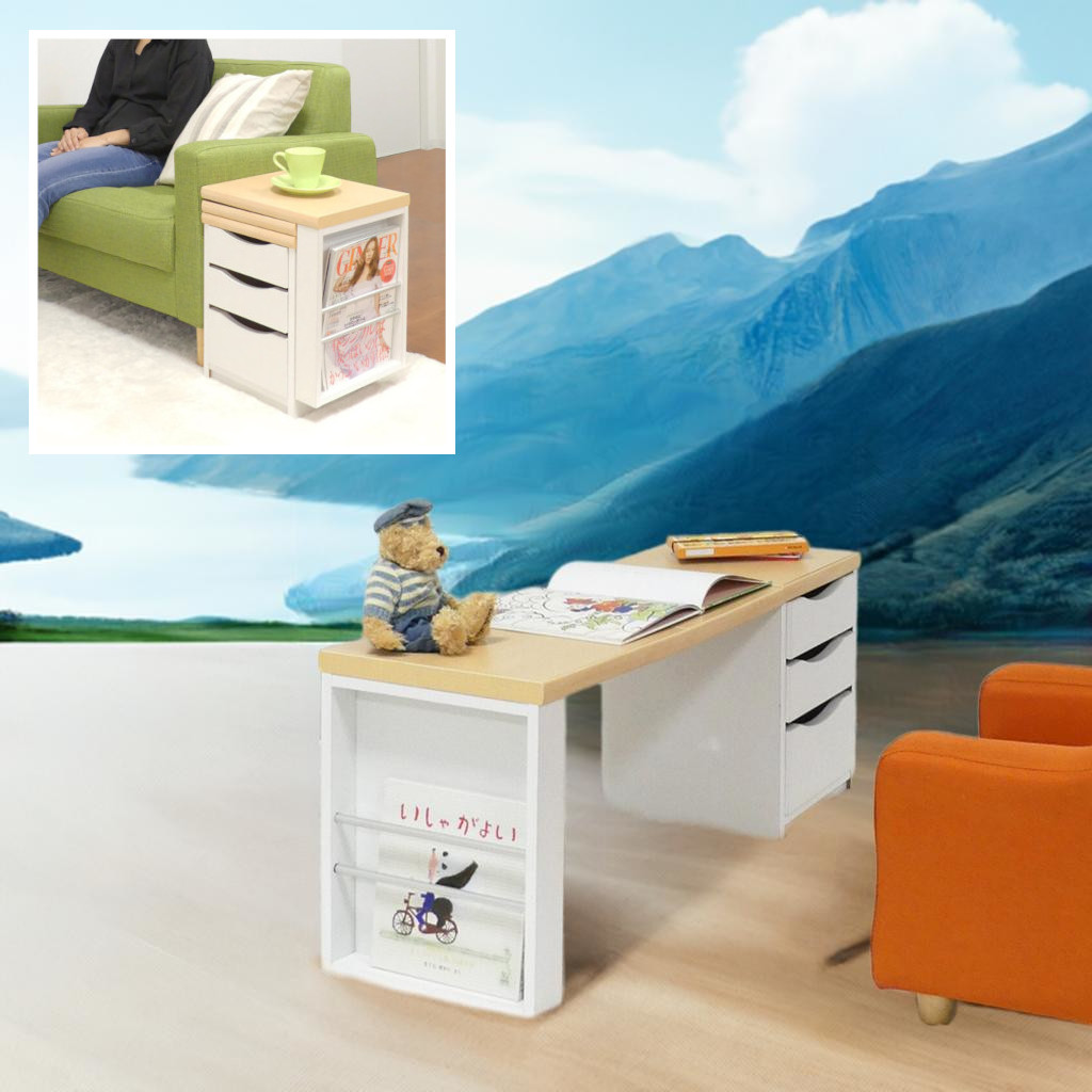 使いたいときにサッと広げるだけで使用でき、折りたたんで収納できます。引出は浅型2杯、深型1杯で両面から使える仕様。大人から子どもまでお使いいただけるシンプルデザイン。組立不要の完成品。サイズ幅90.5×奥行30.5×高さ38cm 折りたたみサイズ幅34×奥行30.5×高さ43cm 引出内寸(小2杯) 約幅22×奥行26.5×深さ6.5cm 引出内寸(大1杯) 約幅22×奥行26.5×深さ10cm。生産地日本。素材プリント紙化粧繊維板