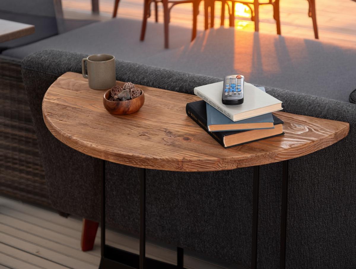 半円形のコンソールテーブル。様々なシチュエーションで場所を選ばず使用できます。 味のある天板と、スタイリッシュなアイアンレッグの異素材デザイン。木目ブラウンがとてもおしゃれ。商品サイズW83×D35×H72cm 商品重量約7kg 素材材質天然木(パイン古材) 水性塗装 アイアン 粉体塗装。材料に古材を使用しておりますので木部の虫食い穴や傷、亀裂などは本製品の特性としてご理解ください。お客様組立式