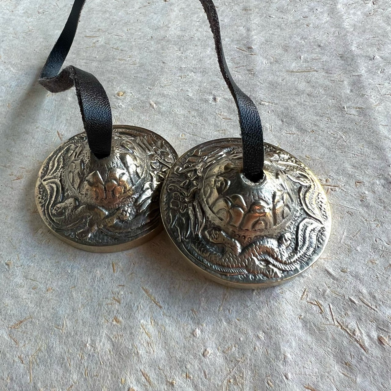 革紐を均等な長さで持って、優しくシンバルを当てると綺麗な音を奏でてくれます。