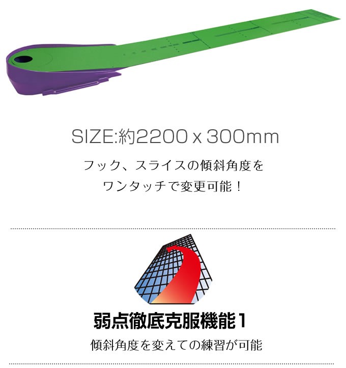 藤田寛之プロ×タバタ共同開発フックとスライス、それぞれ傾斜角度が2段階調整可能な多機能パターマット。様々なアンジュレーションを設定でき、実践的なパット感覚が身に付きます。360度回転可変カップで変化を持たせた練習が可能です。「スパット」を目印にしてラインに頼らない実践的な練習も可能。基本となるストレートの練習も可能なようにストレートbラインも実装しています。