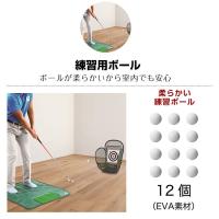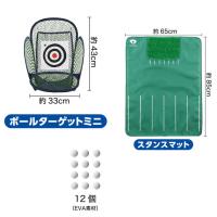 自宅でアプローチ練習ができる、ショットマット付きスタンスマット、練習用ボール(12個)、ボールターゲットミニをセットにしたアプローチ練習器です。スタンスマットのアシストラインに合わせて、スタンスの幅とボールの位置を変えることで、ロブショットとランニングショットが練習できます。