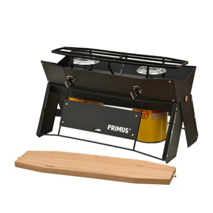 非常にすっきりとコンパクトに収納ができ、ショルダーバッグのように持ち運ぶことができるツーバーナーです。 ウッドボードを外しX字型に開いてセッティングするとウィンドスクリーンと一体になった火口が現れます。ウッドボードは収納時はゴトクの上に載せて蓋のようになり、また、鍋敷きにもなります。
