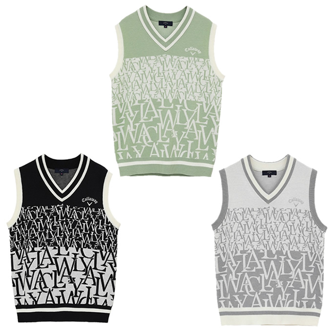 CALLAWAYロゴのタイポグラフをジャカードで表現。ロゴ大きさグラデーションと地色の配色で変化をつけたベスト。大柄ながら、シックな色目でコーディネイトの幅の広いベストです。