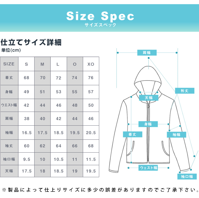 O(着丈/74cm、身幅/55cm、ウエスト幅/48cm、肩幅/44、袖幅/19.5cm、袖丈/66cm、袖口幅/11cm、天幅/19)