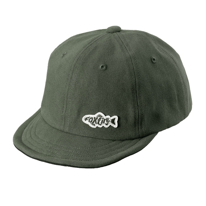 Foxfireの文字で魚を模ったワンポイントワッペンが付いた洗いざらしのキャンバスキャップ。畳んでポケットやバッグに収納できるクラッシャブル構造で、ツバの形状を自在に変えられるワイヤー入り。背面はベルトアジャスター仕様です。