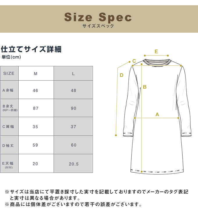 L ( 身幅/48cm、身丈(NP〜前裾)/90cm、肩幅/37cm、袖丈/60cm、天幅(付付)/20.5cm )