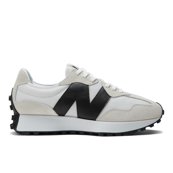 70年代を席巻した数々のニューバランスのレーシングシューズをアレンジしたレトロなフォルムに、ビッグNロゴを外側だけに配した印象的なルックスで提案するメンズモデル「MS327」から新色が登場。スエードとメッシュ素材のアッパーを、ホワイト/ブラックのコンビネーションカラーで展開。