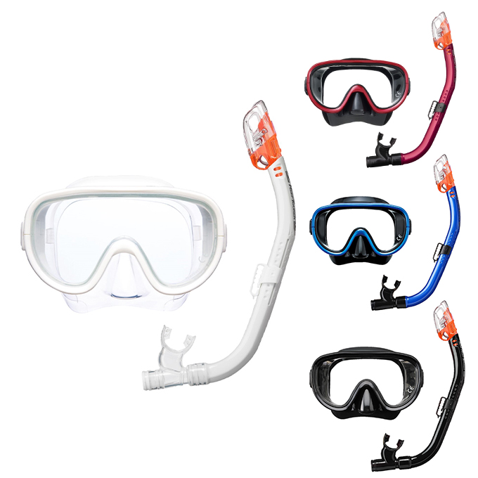 テンパードガラスレンズのマスクと、排水弁付きドライトップスノーケルの大人用2点セット