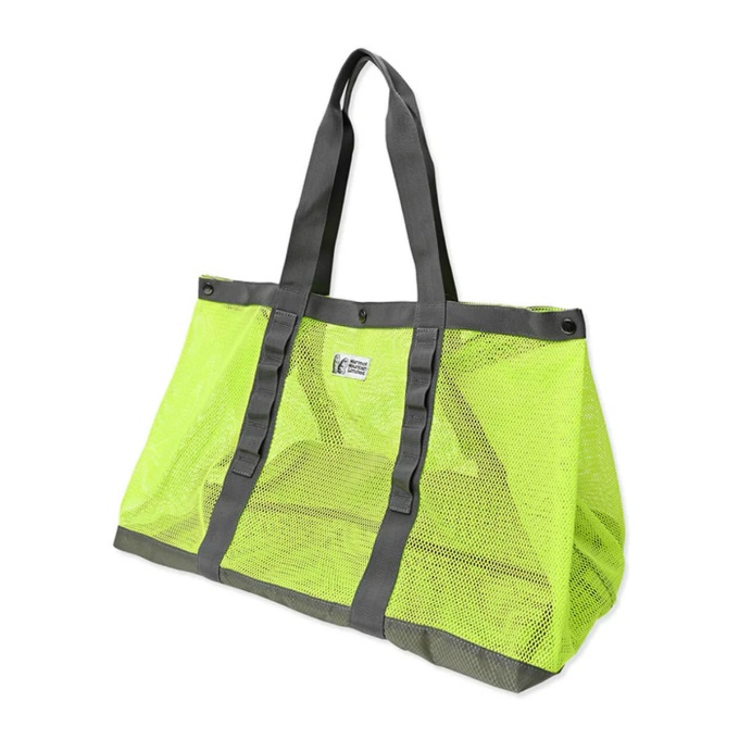 本体生地に適度なハリ感のあるメッシュ生地を採用したトートバッグ。メッシュ素材なので、キャンプやビーチ、プール等で濡れた衣類やタオル等を入れて持ち運ぶのに最適です。また、ランドリーバッグやショッピング等の日常使いにも重宝します。洗っても乾きやすいメッシュ素材のため、汚れも怖くありません。正面にはデイジーチェーン付で、カラビナ等を取り付けて使いやすいようにカスタムも可能です。