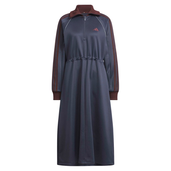 トラックトップとドレスが組み合わされた、すべてがアイコニックなアディダスのスポーツウェア。