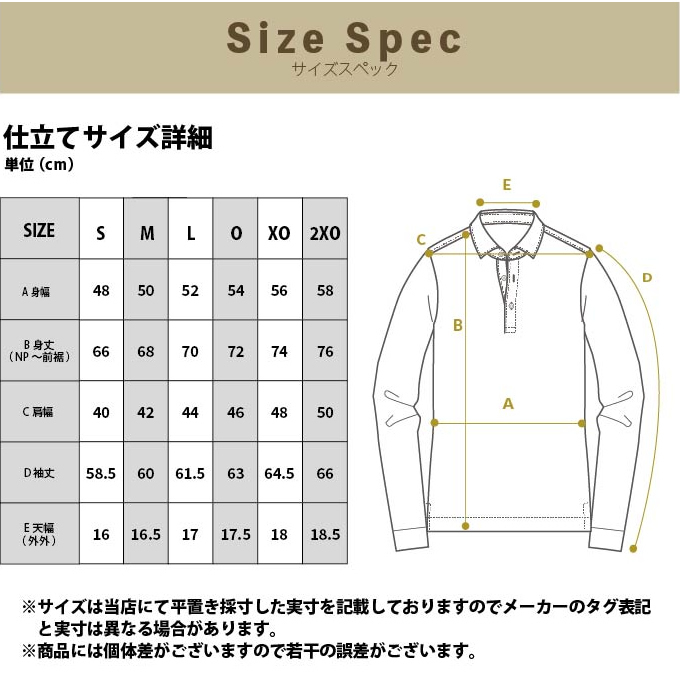 S ( 身幅/48cm、身丈(NP〜前裾)/66cm、肩幅/40cm、袖丈/58.5cm、天幅(外外)/16cm )