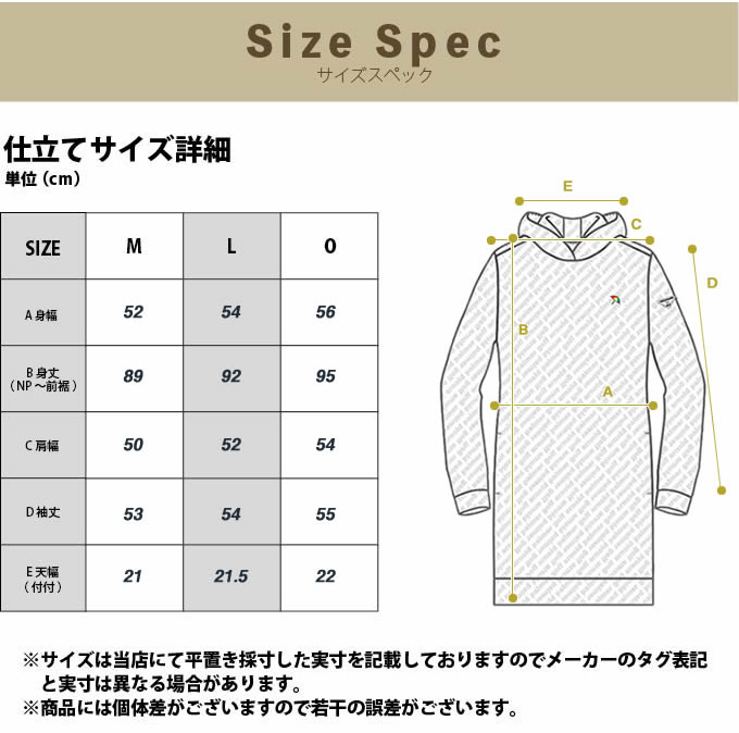 M ( 身幅/52cm、身丈(NP〜前裾)/89cm、肩幅/50cm、袖丈/53cm、天幅(付付)/21cm )