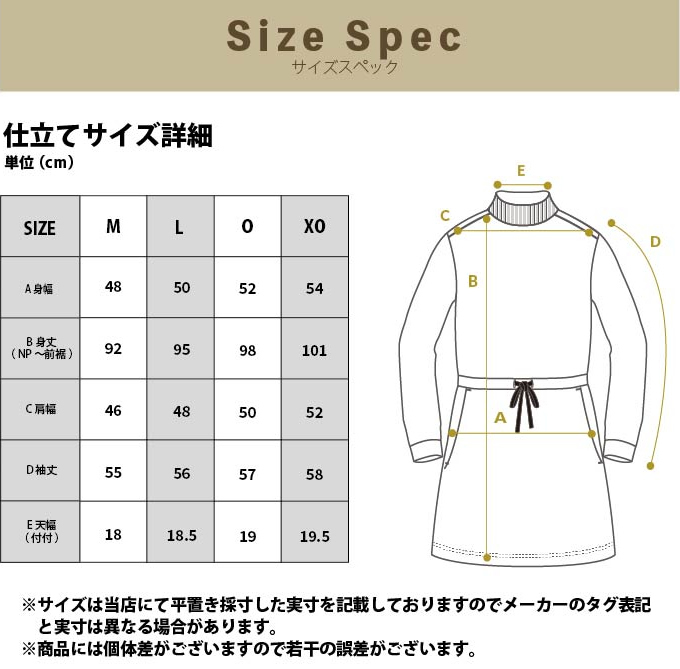 XO ( 身幅/54cm、身丈(NP〜前裾)/101cm、肩幅/52cm、袖丈/58cm、天幅(付付)/19.5cm )