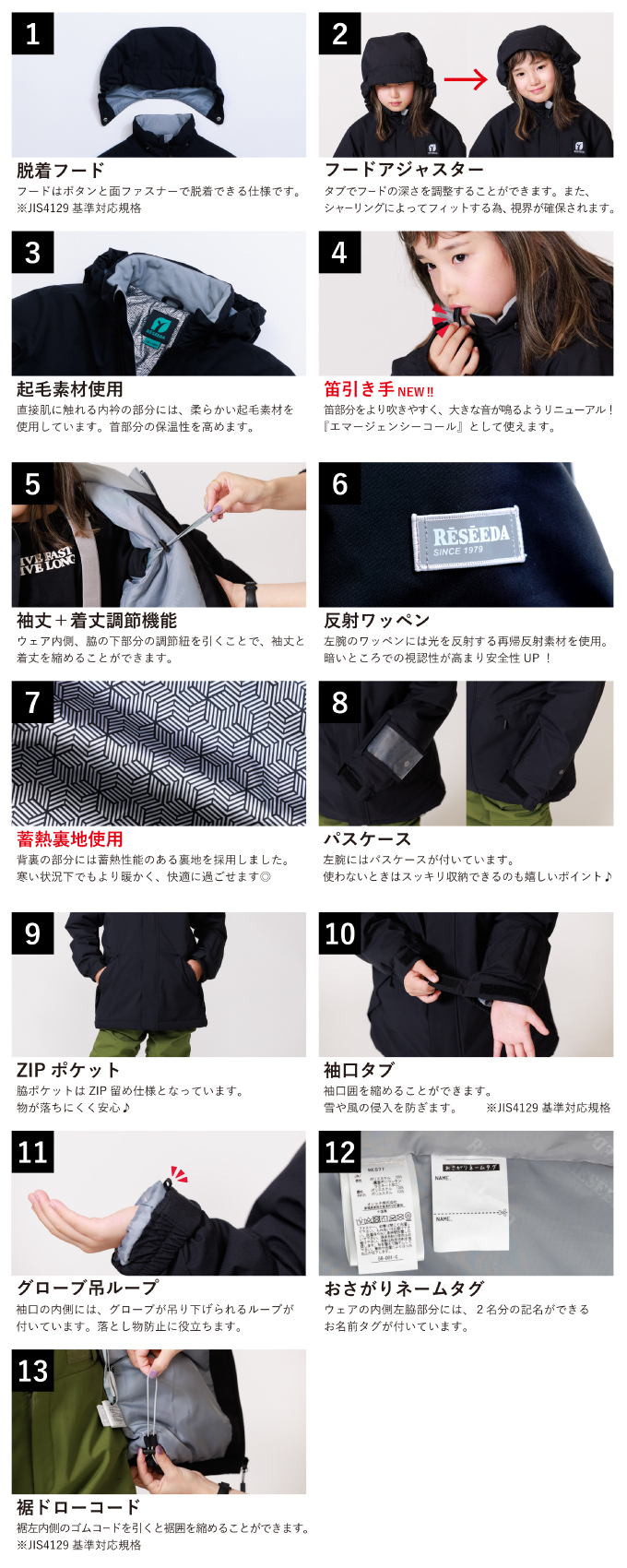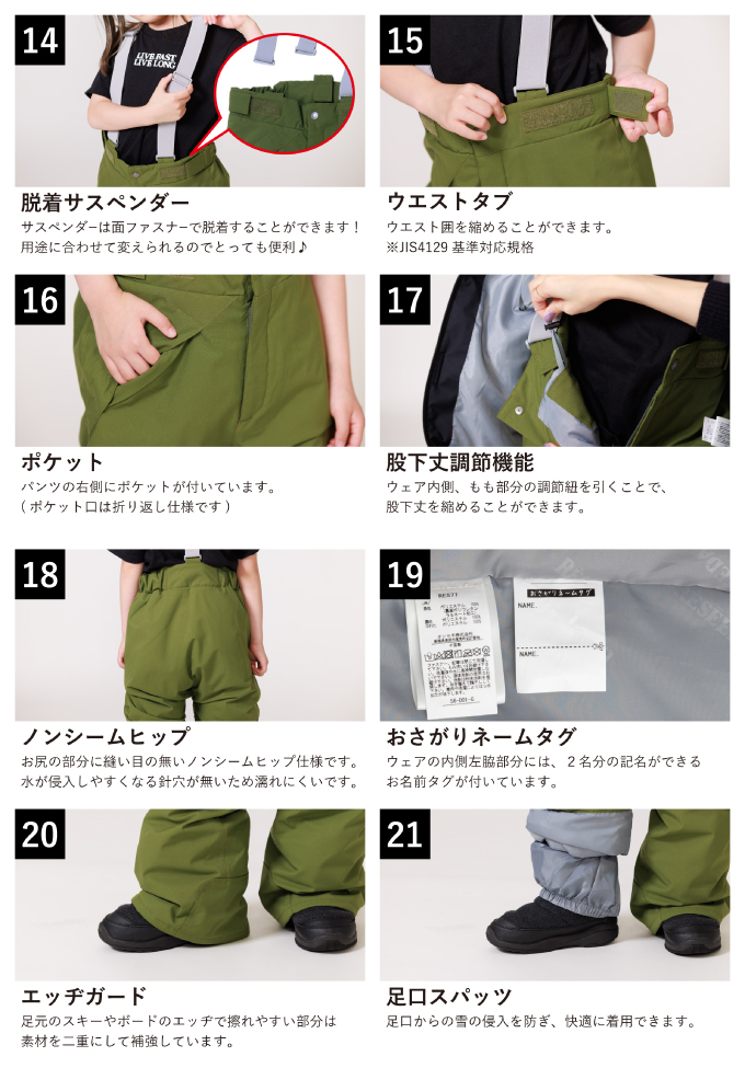 脇や膝の配色がポイント 少し大きめサイズなのでスキーはもちろん、ボードウェアにもピッタリです RESEEDAではお子様の安全に考慮し、JIS規格に対応して作られています。