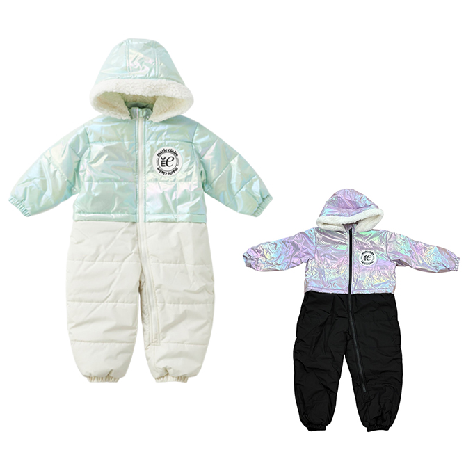 ・冬遊びに最適な中綿入りのジャンプスーツは膝下までのファスナー付きで着脱しやすい設計。袖部分の裏地は出し入れがスムーズなポリエステル素材、袖以外は肌触りの良いフリース素材で暖かい仕様になっています。