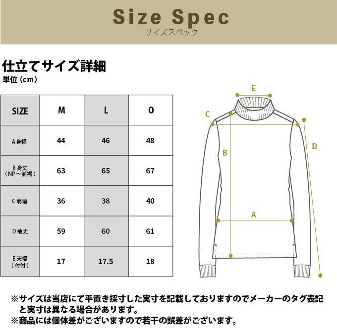 L ( 身幅/46cm、身丈(NP〜前裾)/65cm、肩幅/38cm、袖丈/60cm、天幅(付付)/17.5cm )