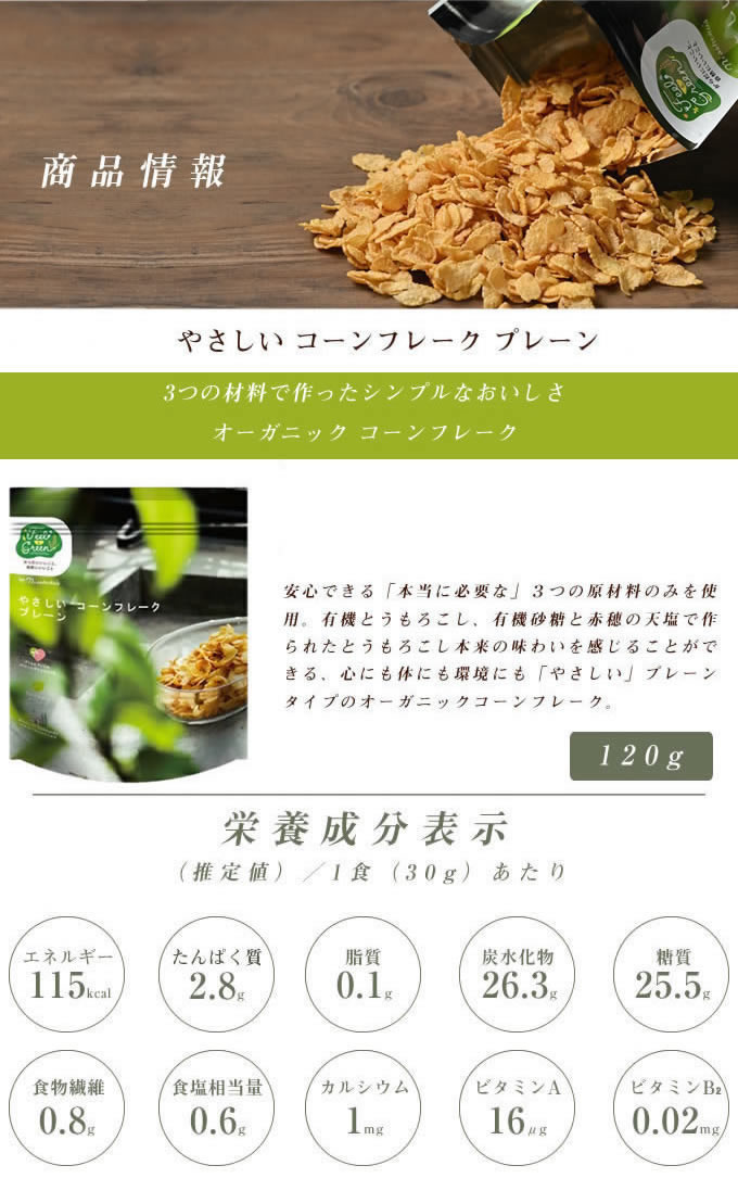 ■原材料:有機コーングリッツ(有機とうもろこし)、有機砂糖、食塩(赤穂の天塩)