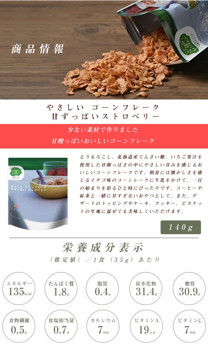 ■原材料:コーングリッツ(とうもろこし)、てんさい糖(てんさい(北海道産))、いちご果汁、食塩、麦芽エキス/乳化剤